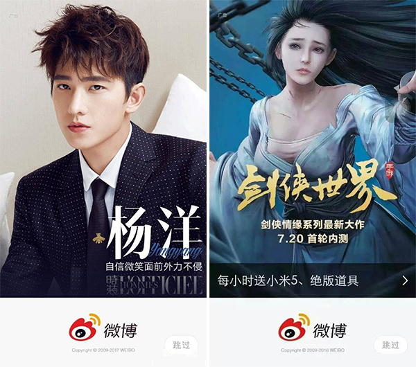 微博開屏廣告形式有開屏靜態版和開屏互動版,也可以帶鏈接跳轉到其他網站,因此吸引了大量的明星和企業做品牌宣傳。