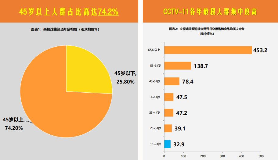 帶動頻道收視上揚,傳播效果更優!CCTV-11改版后,全天各時段收視份額上漲明顯。45歲以上中老年受眾居多,觀眾忠實度高,粘性強。