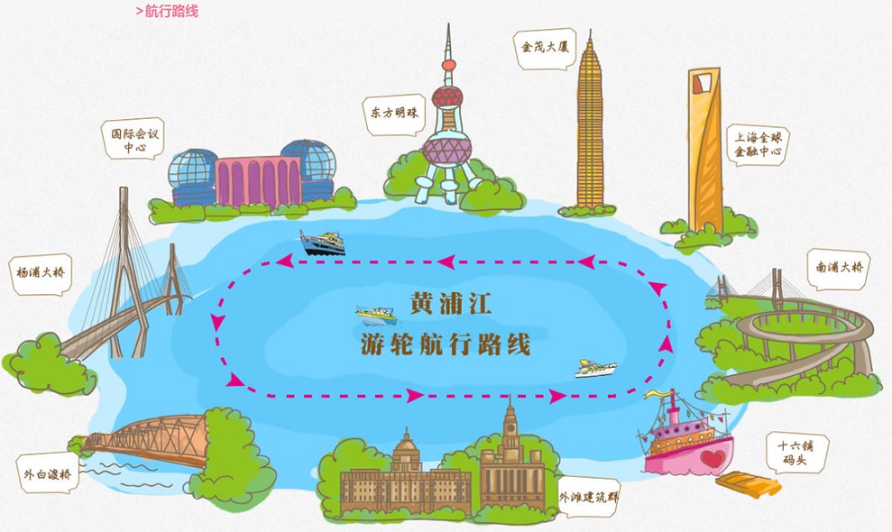 主要航線為浦江精華游(港口局統(tǒng)一安排,每日航班時(shí)間不同。)(十六鋪碼頭至公平路碼頭),瀏覽整個(gè)外灘風(fēng)景。整個(gè)航線時(shí)間約為45分鐘左右。
