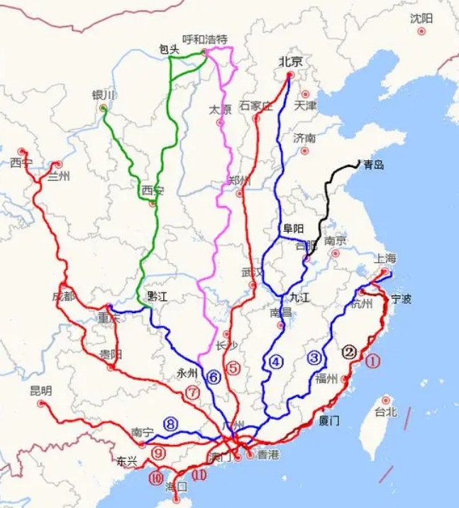 一、甬廣高鐵,寧波-臺州-溫州-福州-廈門-漳州-汕頭-汕尾-廣州,設計時速350公里,是沿海高鐵的重要組成部分,也是《國家綜合立體交通網規(guī)劃綱要》中的長三角-粵港澳交通主軸的組成部分,正在規(guī)劃建設,尚未貫通。正線引入廣州站,與廣湛高鐵貫通,在深汕站引出時速350公里的聯絡線至深圳西麗,在寧波西站與滬蘇嘉甬高鐵貫通,經嘉興南轉滬昆高鐵至上海。