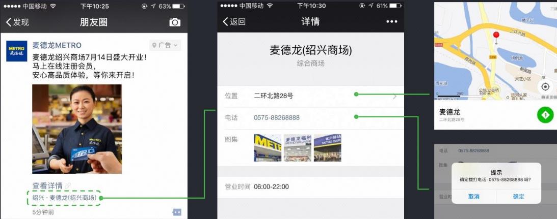 (5)門店標(biāo)識(有線下門店可展示):點擊跳轉(zhuǎn)門店詳情頁,可拉起地圖導(dǎo)航、一健撥號功能,支持單條廣告多門店投放(上限100家)。