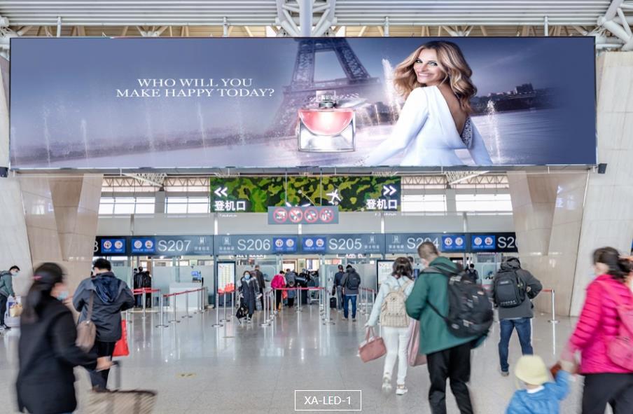 西安咸陽機(jī)場廣告-西安咸陽機(jī)場T2航站樓出發(fā)值機(jī)大廳安檢正上方led廣告