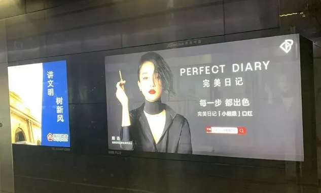 在去年10月,完美日記于北京、廣州、深圳、上海、杭州等全國100個核心城市投放60萬部電梯智慧屏,配合首支品牌廣告,官宣演員周迅為品牌全球代言人,為其全新的品牌形象宣傳造勢。